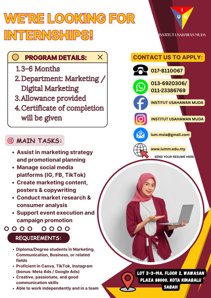 Bukan cari pekerja ya — khas untuk pelajar Diploma/Degree yang nak kumpul pengalaman dalam bidang Marketing / Digital Marketing.