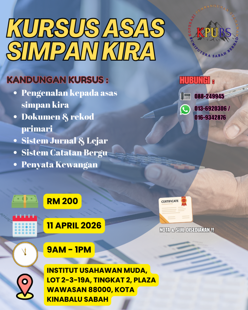 Ingin memahami aliran kewangan dengan lebih teratur Sertai Kursus Asas Simpan Kira dan pelajari kemahiran penting yang diperlukan dalam dunia kerja dan perniagaan