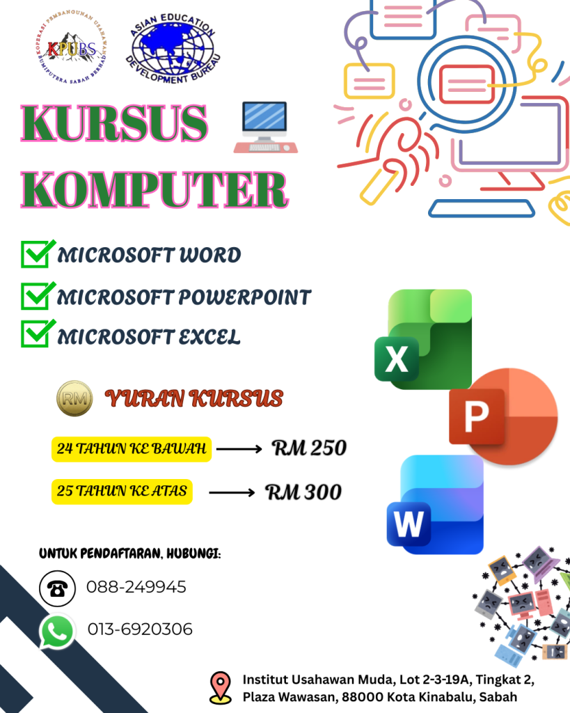 Tingkatkan kemahiran anda dan kuasai asas komputer dengan lebih yakin melalui Kursus Komputer yang praktikal dan mudah difahami. Sesuai untuk pelajar, pencari kerja, dan mereka yang ingin menambah kemahiran pejabat.