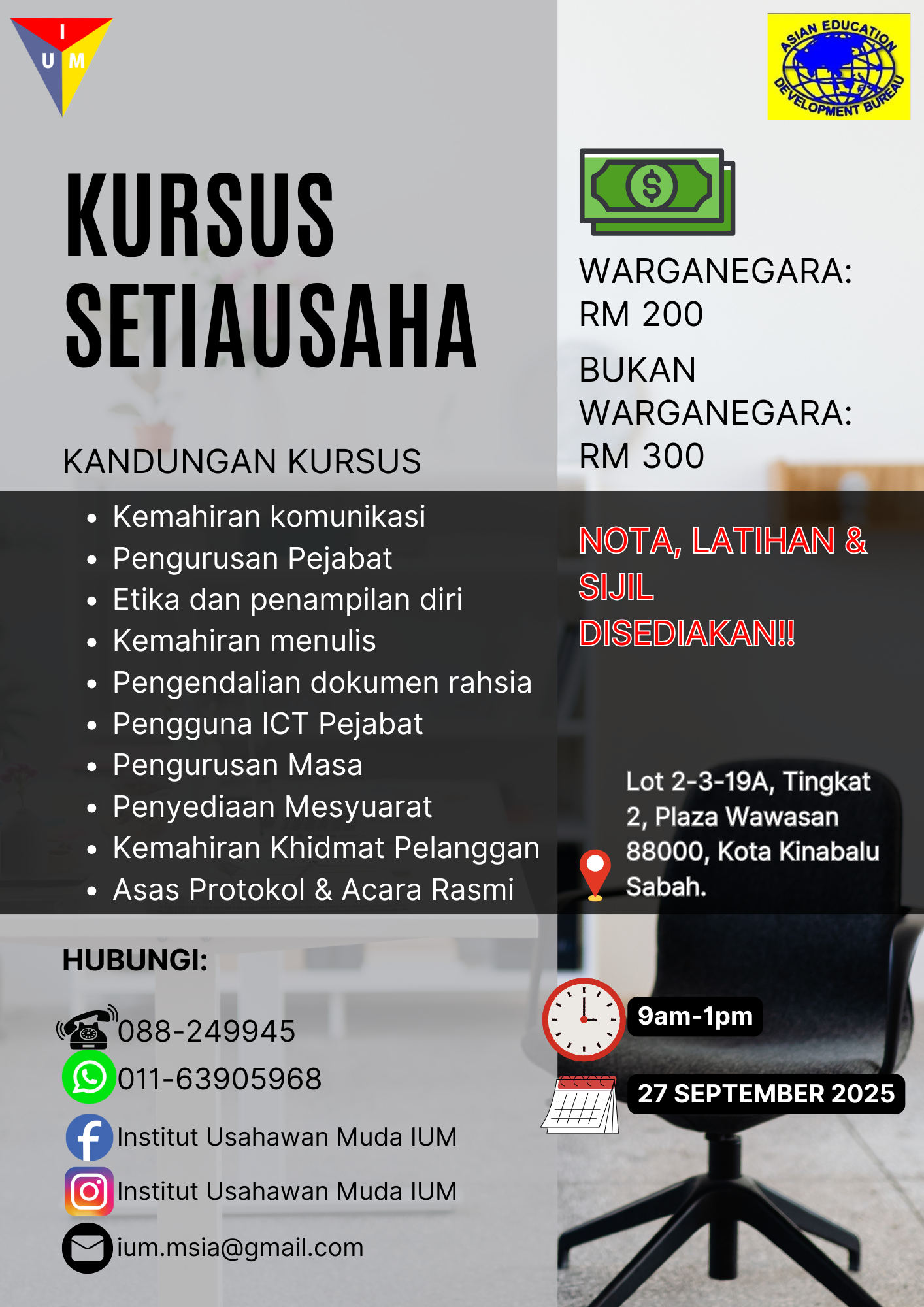 Nak mula berniaga tapi tak tahu cara uruskan dengan betul? Atau mahu tambah ilmu untuk naik taraf kerjaya? Sertai Kursus Pengurusan Perniagaan anjuran Institut Usahawan Muda Malaysia (IUMM) di Kota Kinabalu!